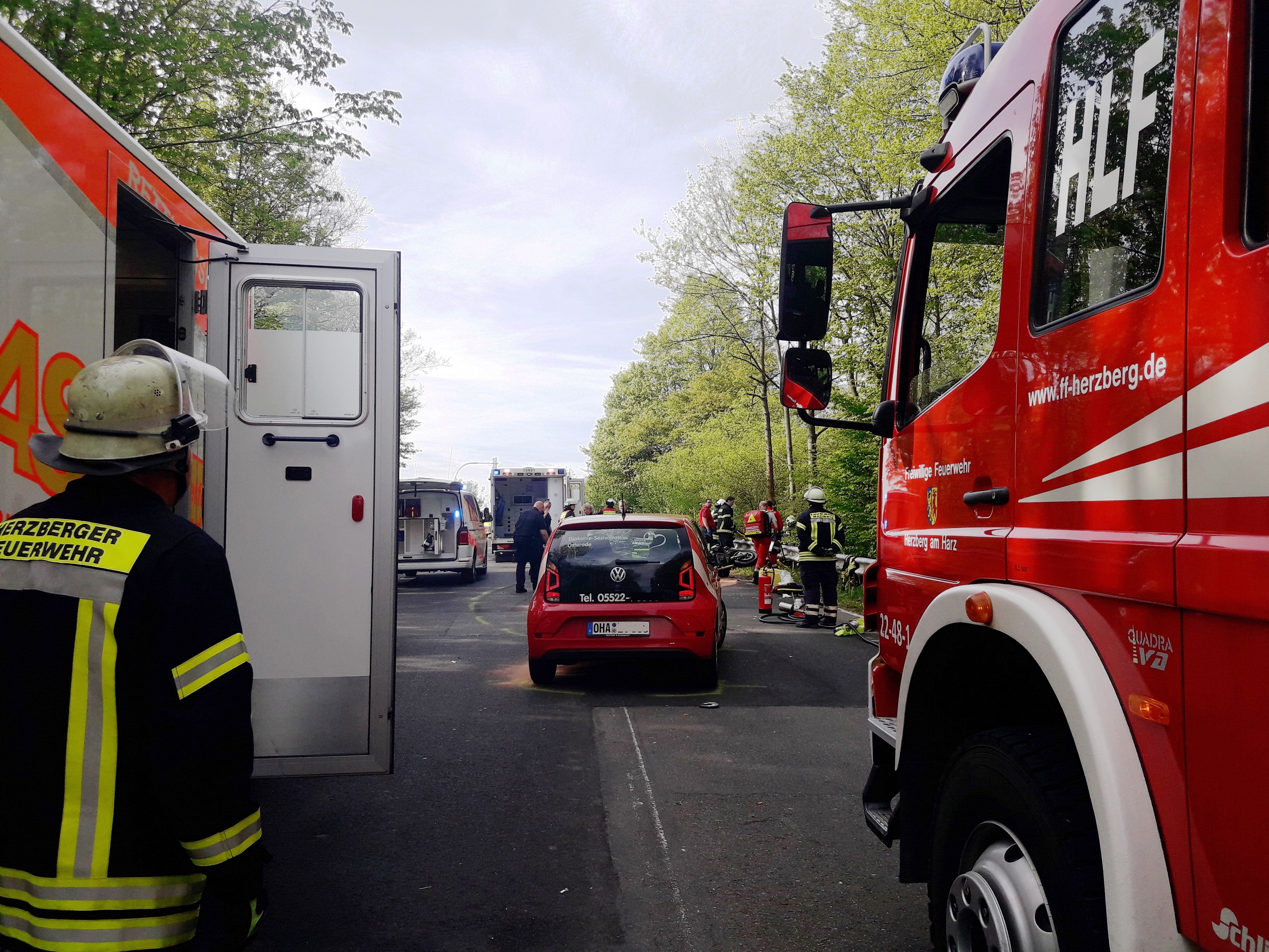 Die schwerstverletzte Motoradfahrerin wurde vor Ort durch den Notarzt stabilisiert und mit dem Rettungshubschrauber zur Uniklinik Göttingen geflogen. Der leichter verletzte Motorradfahrer sowie die Fahrerin des Kleinwagens wurden ebenfalls vor Ort versorgt und zur weiteren Behandlung mit Rettungswagen in die Klinik Herzberg gebracht. Die Fahrzeuge wurden bei dem Unfall so beschädigt, dass Betriebsstoffe wie Öl und Kühlflüssigkeit ausliefen. Diese wurden mittels Bindemittel abgestreut.
