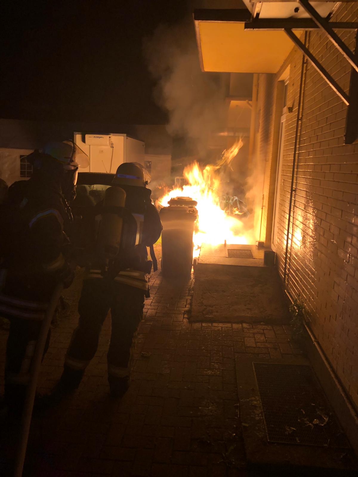 Das Feuer drohte beim Eintreffen der Feuerwehr auf das Gebäude überzugreifen. Von der Polizei wurden vier schlafenden Hausbewohner geweckt und ins Freie evakuiert. Ein Übergreifen der Flammen auf das Gebäude konnte durch die Feuerwehr verhindert werden. Die Reste der brennenden Mülltonnen wurden unter Atemschutz auseinandergezogen und abgelöscht, das Gebäude anschließend auf eine Verrauchung kontrolliert.